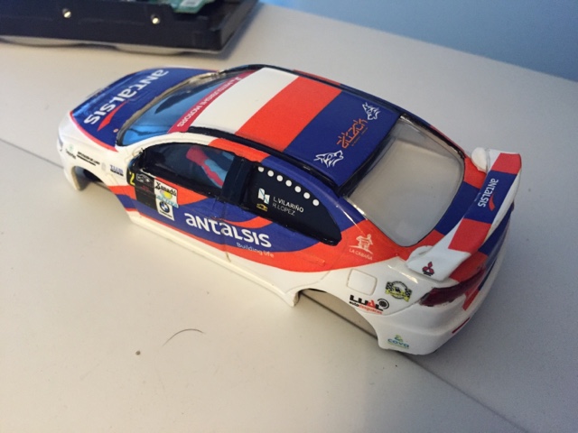 Carrocería artesanal en resina de Darios slot Resins y calcas del mismo fabricante. A falta de colocar el chasis con sus ejes correspondientes. La calca del alerón queda corta por un pequeño error en las calcas que será arreglado por Darío.